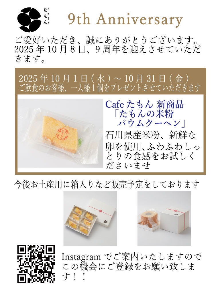 令和7年10月8日Cafeたもんは9周年を迎えさせていただきます!!